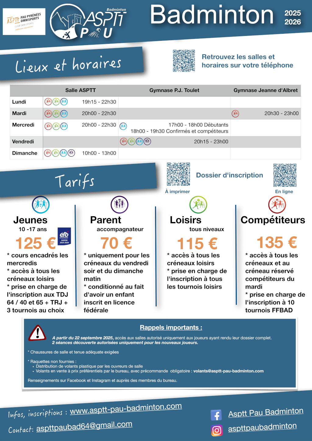 - Chèque signé de 115€ (loisirs) ou 135€ (compétiteurs) à l’ordre de « ASPTT Pau Badminton »